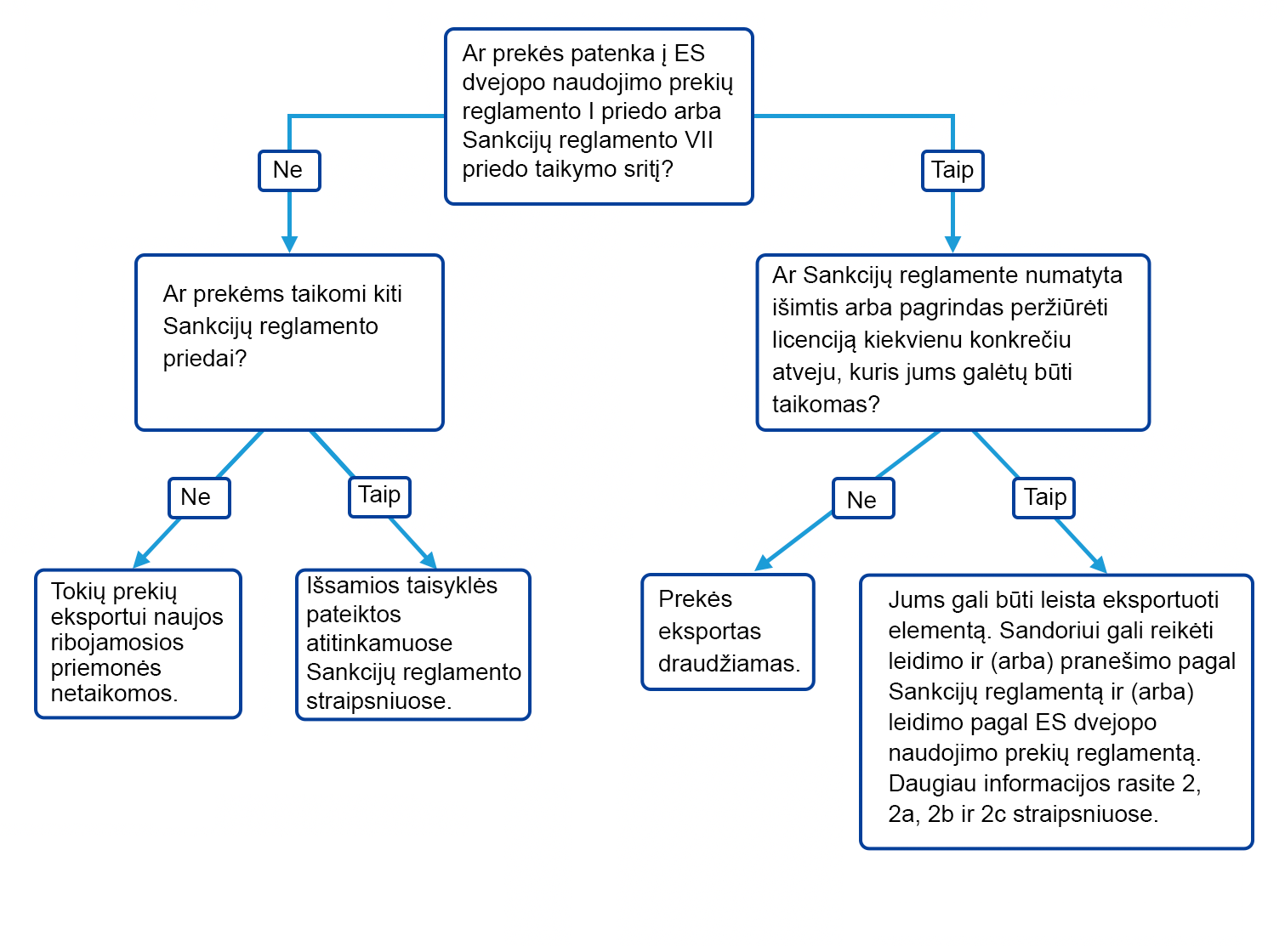 Tai yra supaprastinta schema; norėdami išsamesnių paaiškinimų, kreipkitės į atitinkamas savo valstybės narės kompetentingas institucijas, kad sužinotumėte, ar Sankcijų reglamentas (arba kiti apribojimai) taikomas produktui, kurį parduodate Rusijai.
